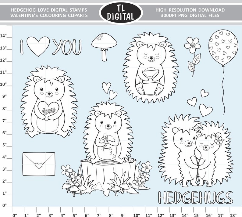 18 Graphics Hedgehog Love Digital Stamps Valentines Day Colouring Clipart High Resolution Png Files Art Collectibles Digital Colonialgolfhart Com